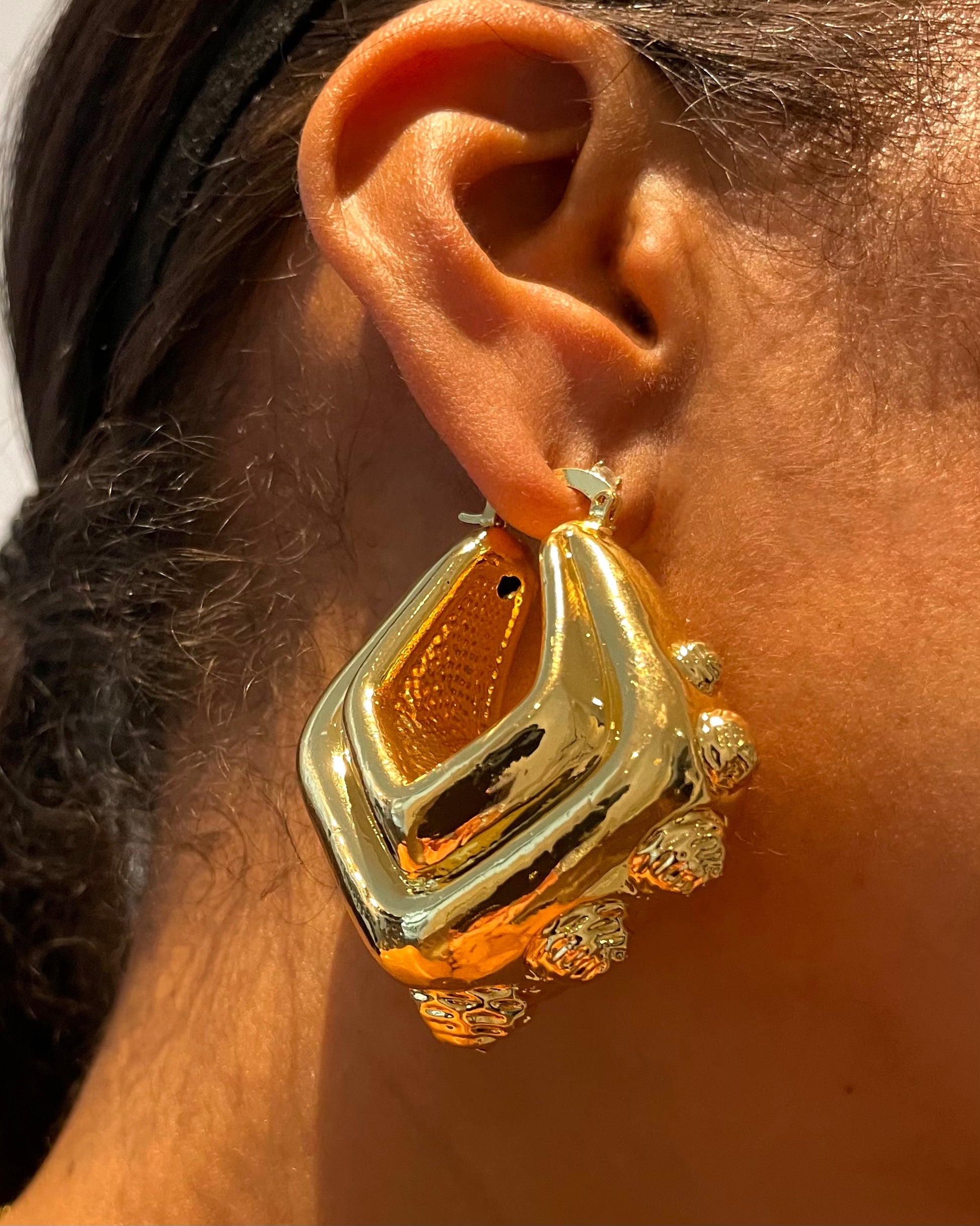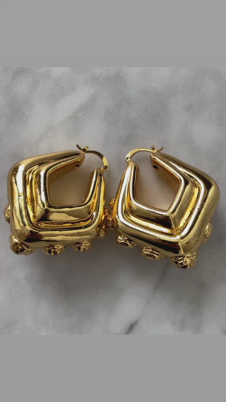 Gold Tone Thick Diamond Shape Hoop Earrings With Textured Bolts Of Gold Trim.