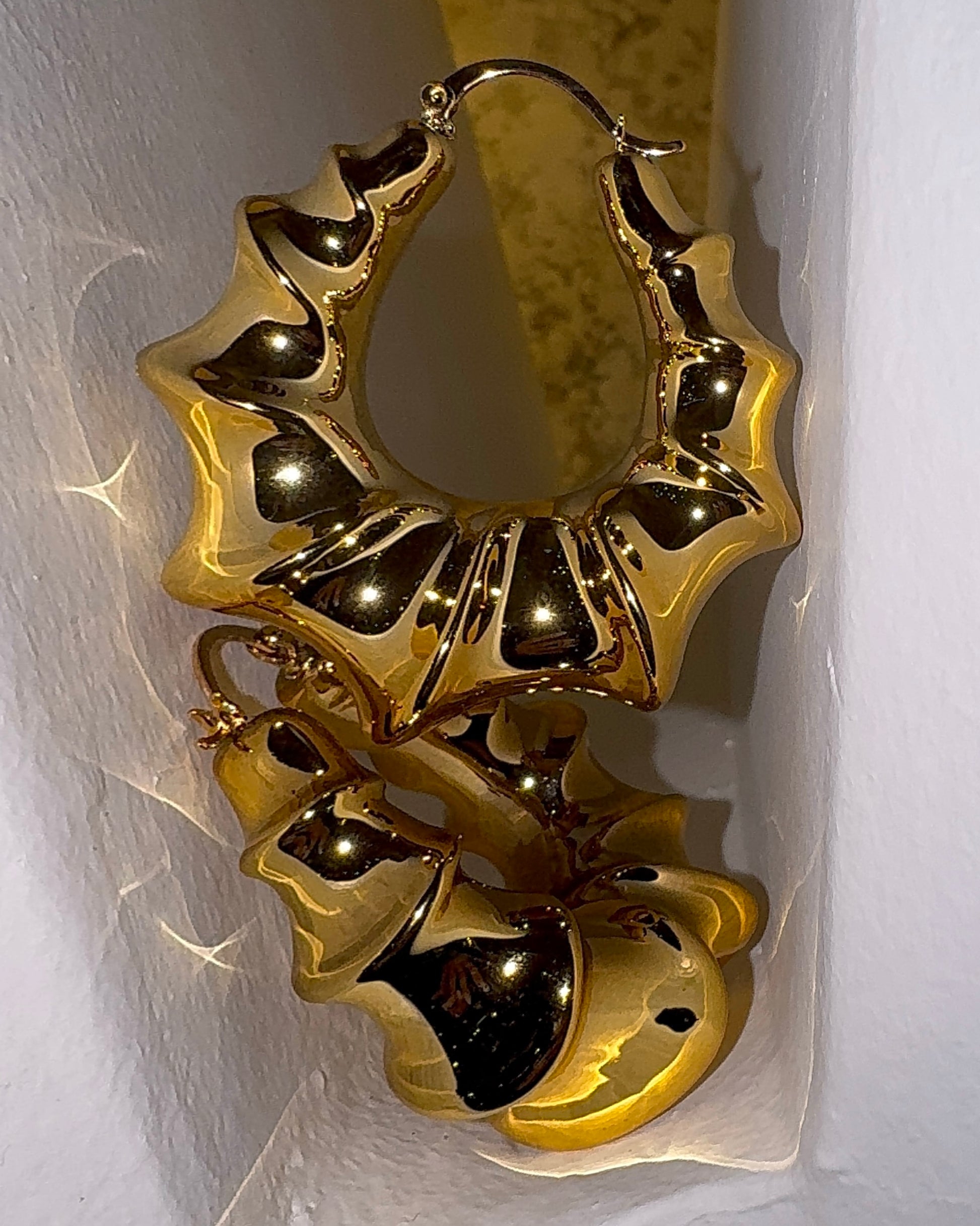 Statement gold hoops with sculptural volume and luminous polish.