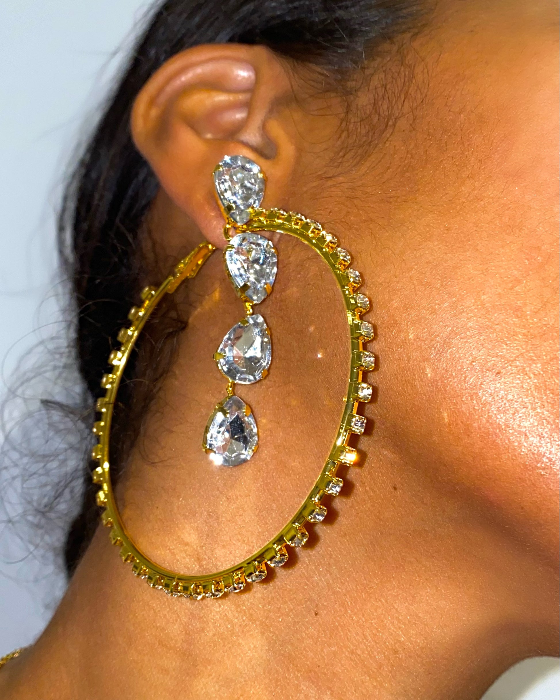 Gold Tone Rhinestone Hoop Earrings With Dripping Teardrop Stones .