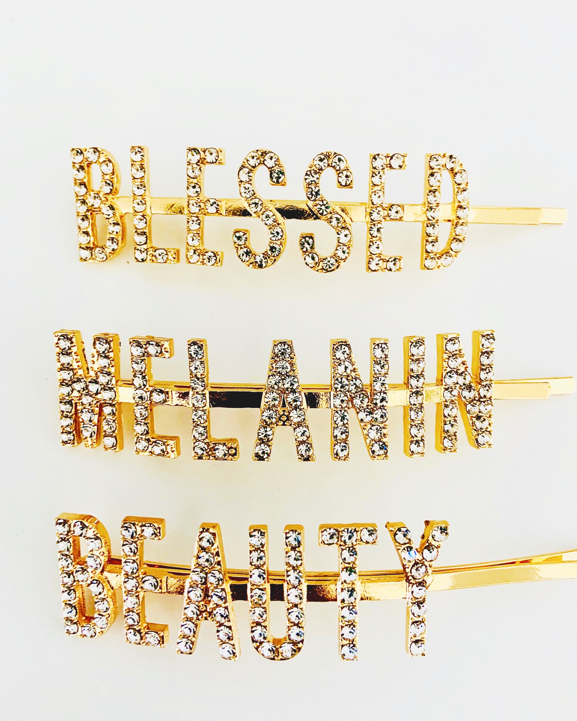 Gold Tone Blessed Melanin Beauty 3 pc Glam Clip Set , Size Large ~ 3.5” Length , Curved Bobby Pin